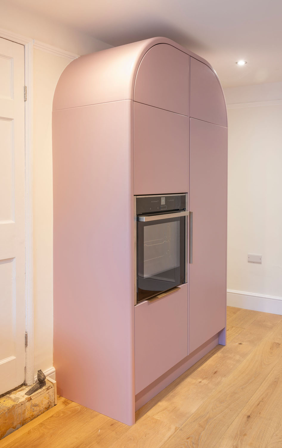 The standout feature, a freestanding curved oven unit, combines functionality with design flair, making it not just an appliance, but a statement piece in its own right.