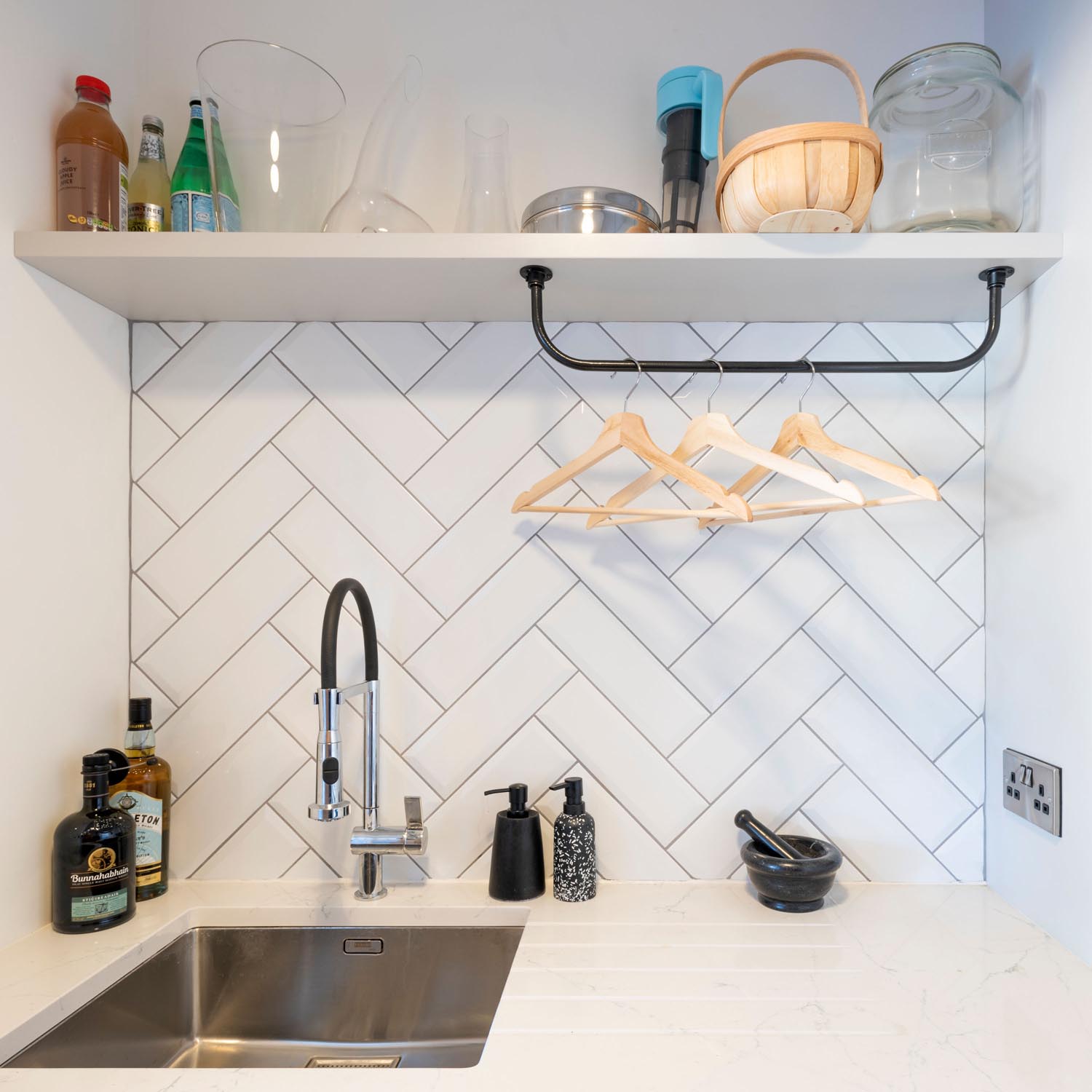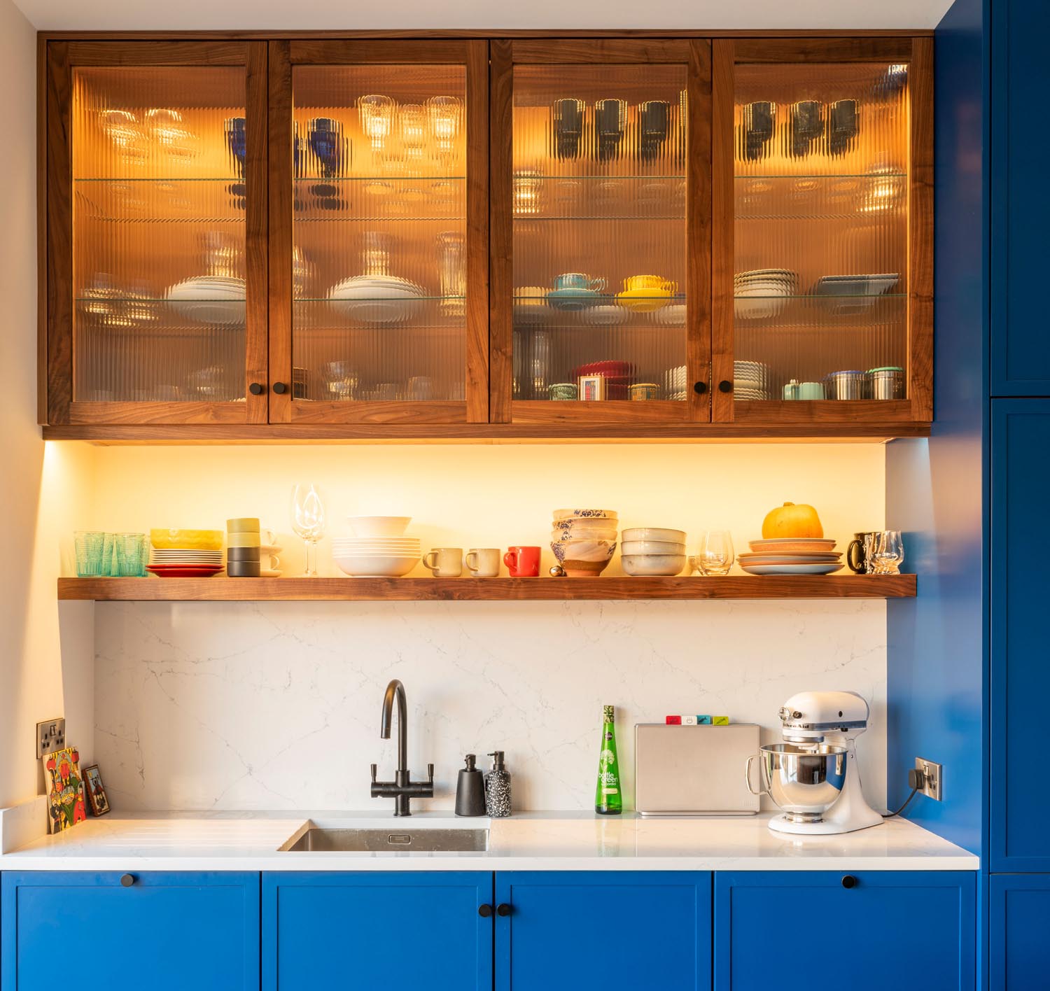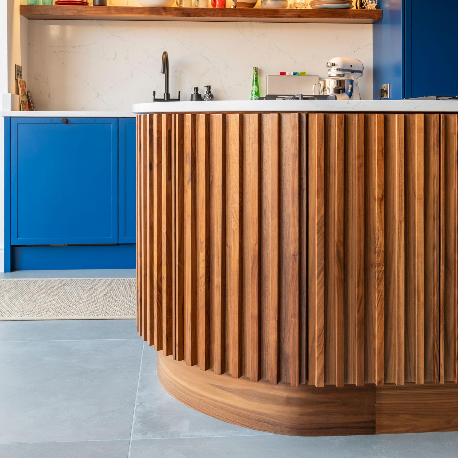 This mid century modern style kitchen is one of our absolute favourite projects we’ve had the pleasure of working on. It combine’s classic shaker style with a modern twist of the thin frames. As well as including some pieces from a couple of our favourite designer’s such as Tom Dixon and Philippe Stark, this wonderful kitchen includes a tablet shaped walnut island with secret cupboards.